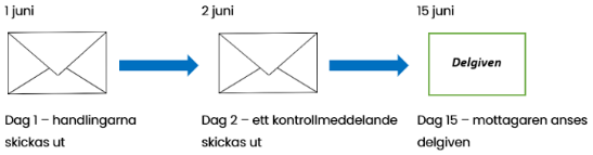 Du är delgiven (dvs. anses ha tagit del av handlingen) två veckor efter att det första brevet skickades till dig. Datumet som brevet skickades framgår av kontrollmeddelandets text.