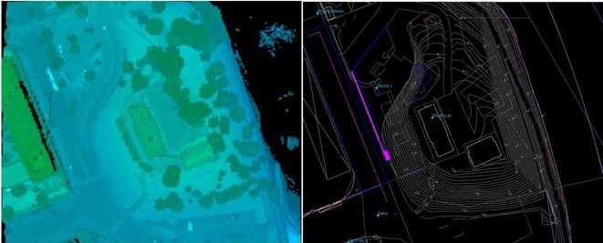 Exempel på höjdinformation från laserscanning (vänster) och utdrag från baskartan (höger).