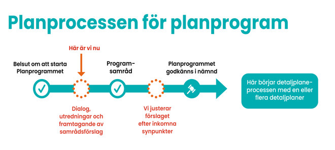 Nu pågår arbete med att ta fram utredningar och framtagande av programhandlingar. Inom de närmsta veckorna planerar vi att bjuda in de fastighetsägare som berörs av programområdet.