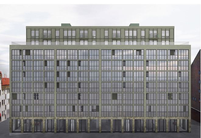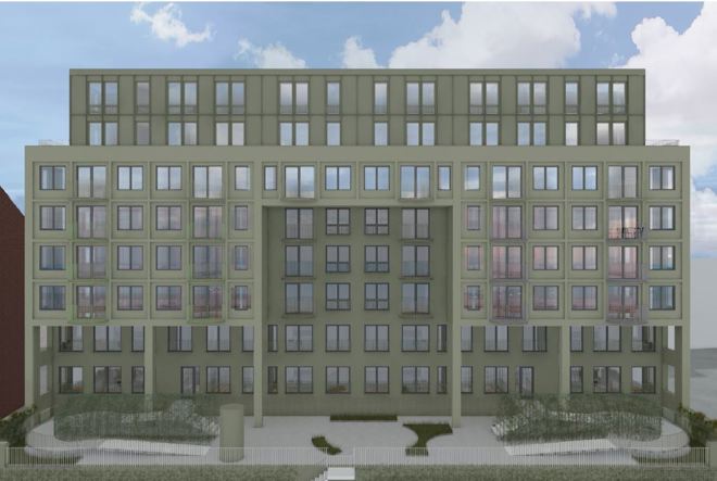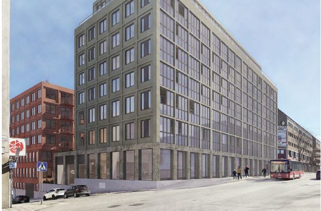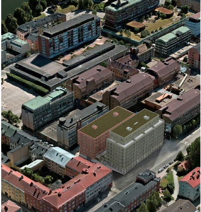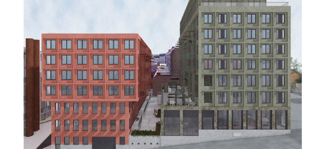 Planen är att bygga två huskroppar i olika färg, med en gård mellan. Parkeringsgarage placeras under gården.