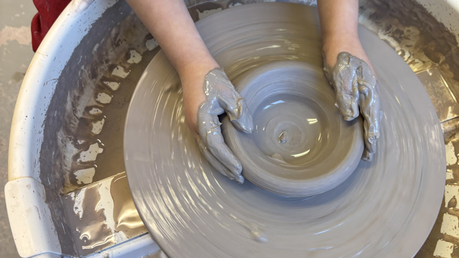 Föreningen Torekällbergets krukmakeri bjuder in barn att testa drejning. Sätt händerna i leran och känn hur den snurrar på skivan!