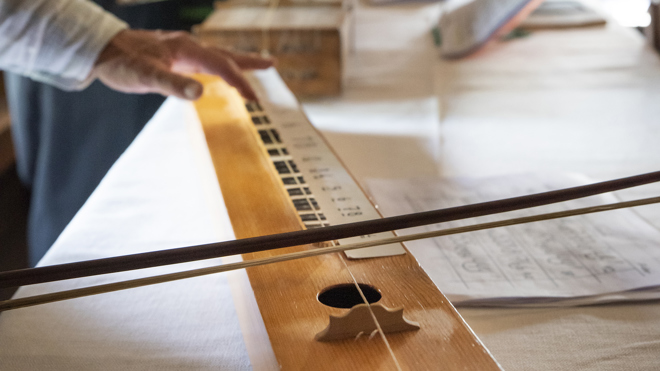 Välkommen in i Lideby småskola. Prova på att spela psalmodikon, ett instrument som var populärt under 1800-talet - inte minst i skolan. Det är lätt och roligt!