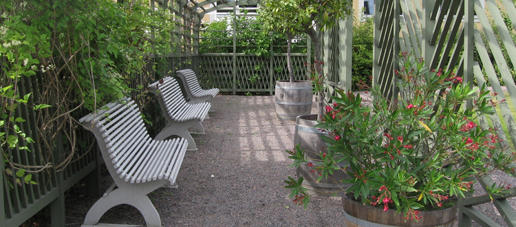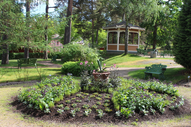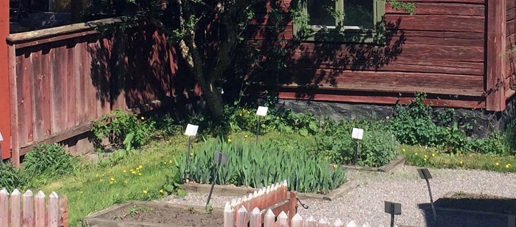 Här i museets apoteksträdgård odlas medicinalväxter som finns omnämnda från apoteket Kronans trädgård i Södertälje 1853, samt några av de vilda växter som apoteket köpte in av samlare.
