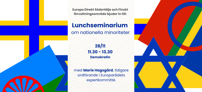 Europa Direkt Södertälje och Finskt förvaltningsområde bjuder in till ett seminarium i november på temat nationella minoriteter tillsammans med Marie Hagsgård, tidigare ordförande i Europarådets expertkommitté för nationella minoriteter.