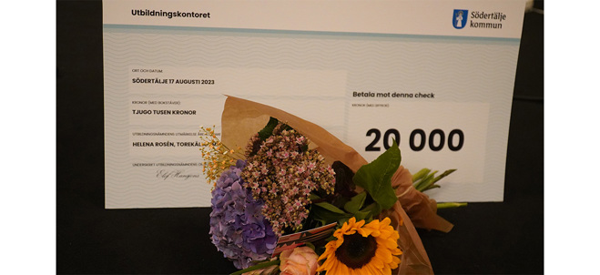Helena Roséns blomsterbukett och check då hon inte kunde delta vid då utmärkelsen delades ut. Hon fick utmärkelsen årets elevhälsomedarbetare på gymnasieskolan. Foto: Södertälje kommun
