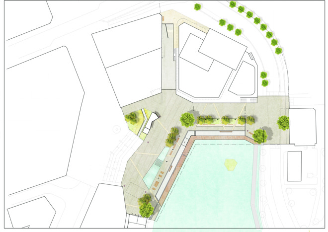 Vi är tvungna att bredda kajen för att få plats med ett antal viktiga funktioner, både rent tekniskt och säkerhetsmässigt, men också för att kunna skapa liv på platsen. Det behövs utrymme för att människor ska kunna vistas där. Här planeras för uteservering vid restaurangerna och separata sittplatser, men även gångstråk längs vattnet och plats för sällskap att umgås. Det behöver också finnas plats för räddningsvägar för räddningstjänst. Växter och träd som tar hand om regnvatten ska planteras. Kontakten med Marens vatten kommer att förbättras så att man verkligen vill vistas här och kunna komma närmare vattnet. Ytan framför hotellet är också ett viktigt stråk för att binda samman Marenplan och centrum med Slussholmen.
