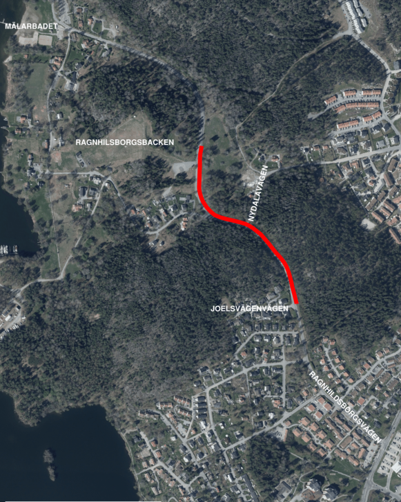 Den nya gång- och cykelvägen kommer börja uppe vid Joelsvägen och ansluta till den redan utbyggda gång- och cykelvägen nere vid norra infarten till Ragnhildsborgsbacken. Se bilden nedan.