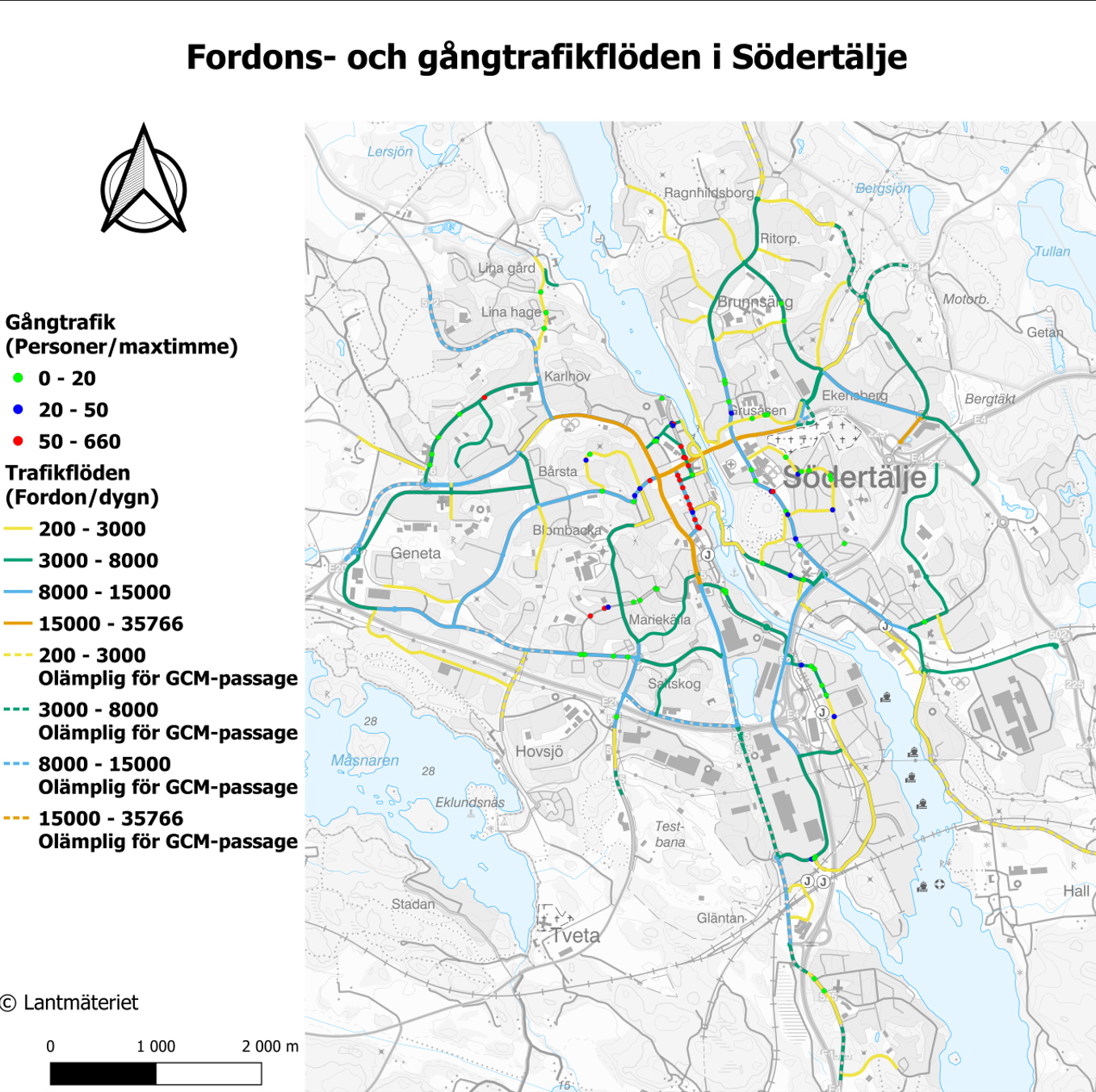 Södertälje kommun har valt att behålla övergångsställen vid 25 gående i maxtimmen där trafikmängden är 3000 per dygn eller fler, då vi i samband med hållbart resande har som mål att få fler att välja gång, cykel och/eller kollektivtrafik.